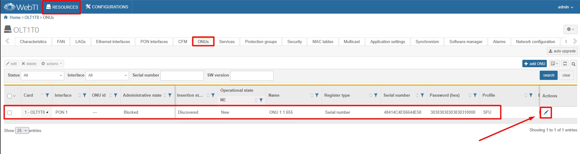 2. Add ONT to GPON port (RESOURCES > ONUs)
