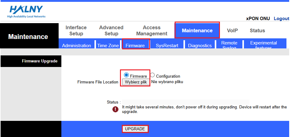 To upload new software image to the ONT, follow the instructions below: