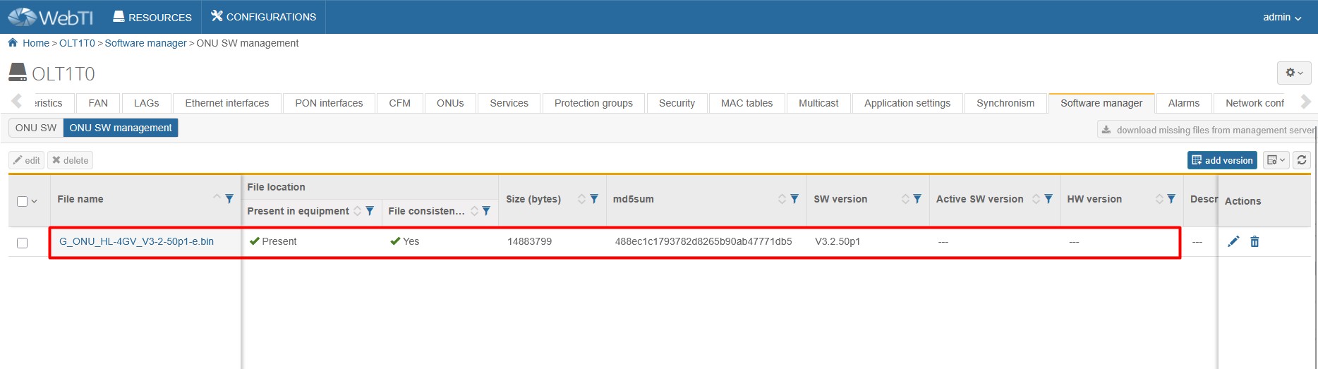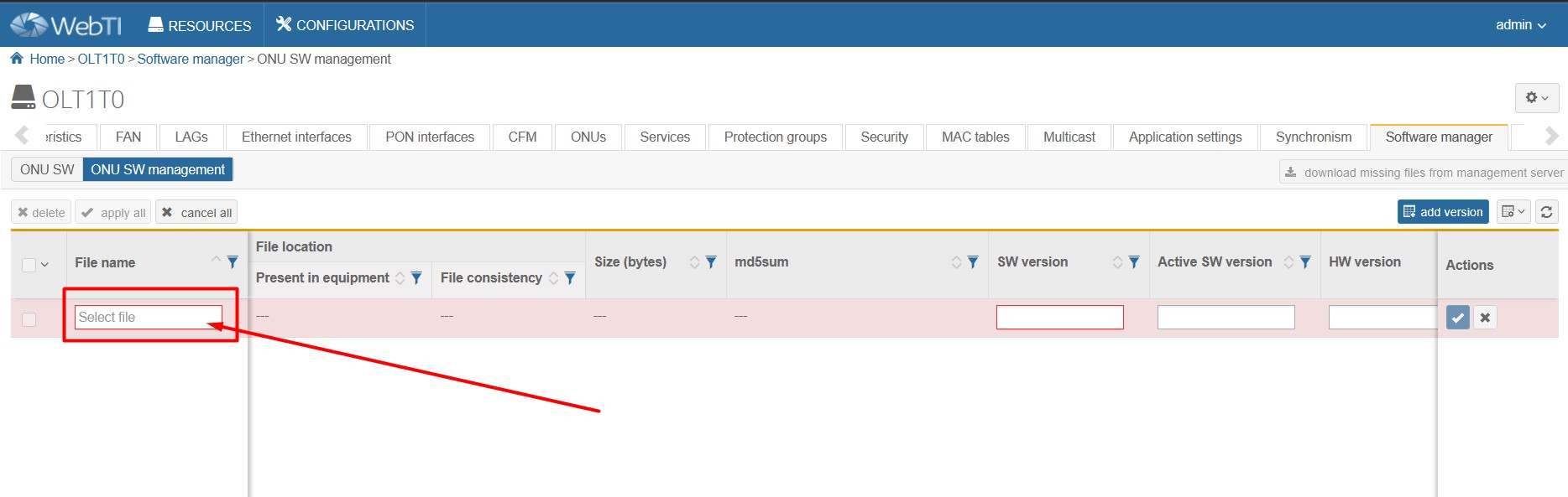 1.Go to Software manager > ONU SW management page.